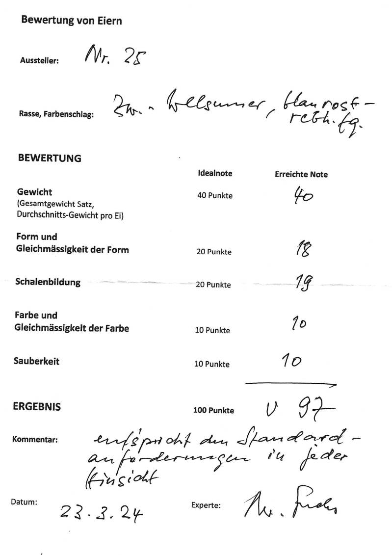 Einmal wurde ein Eiersatz von meinen blau-rostrebhuhnfarbigen Zwergen mit der Maxmalnote V 97 bewertet. Das freute mich sehr.
